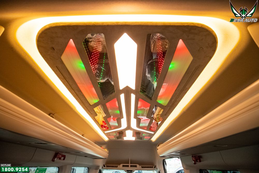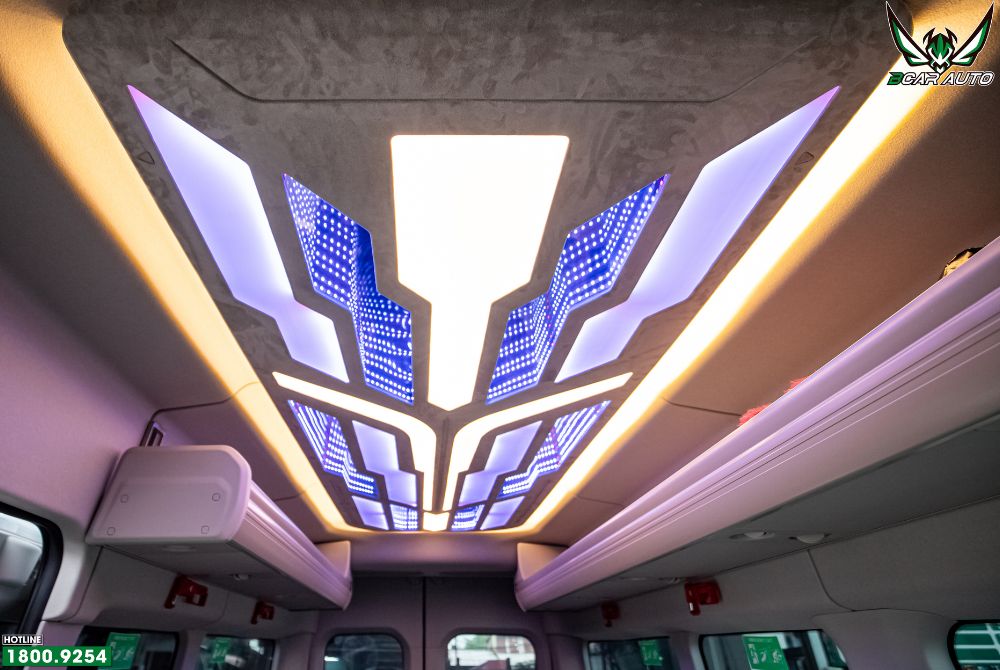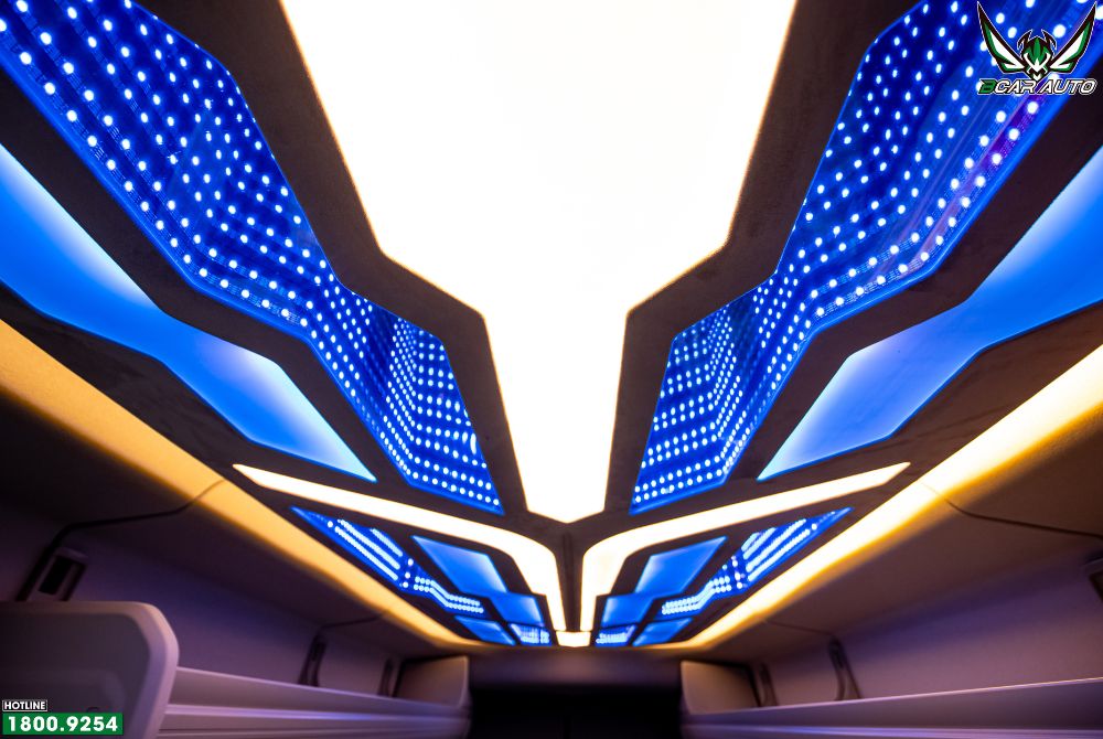 - Sau khi độ tại Bcar Auto: Toàn bộ trần xe được thay thế bằng hệ thống đèn LED khối phi thuyền hiện đại. Việc độ đèn led nội thất ford transit giúp ánh sáng đa sắc kết hợp với các chi tiết bọc da xung quanh tạo nên một không gian lộng lẫy như khoang hạng nhất của máy bay.