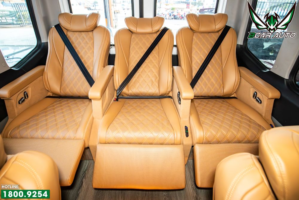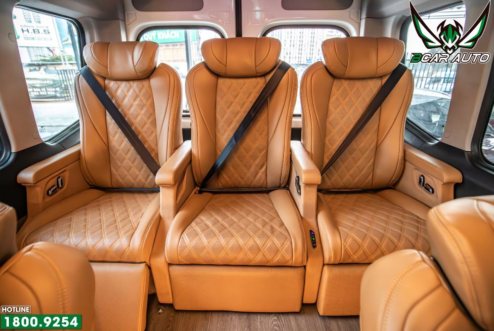 Trong gói độ ghế limousine xe Hyundai Solati, hàng ghế cuối không còn là băng ghế liền đơn giản như cấu hình nguyên bản. Thay vào đó, Bcar Auto thiết kế 3 ghế độc lập, mỗi ghế là một vị trí sử dụng riêng biệt, đảm bảo sự thoải mái cho mọi hành khách.